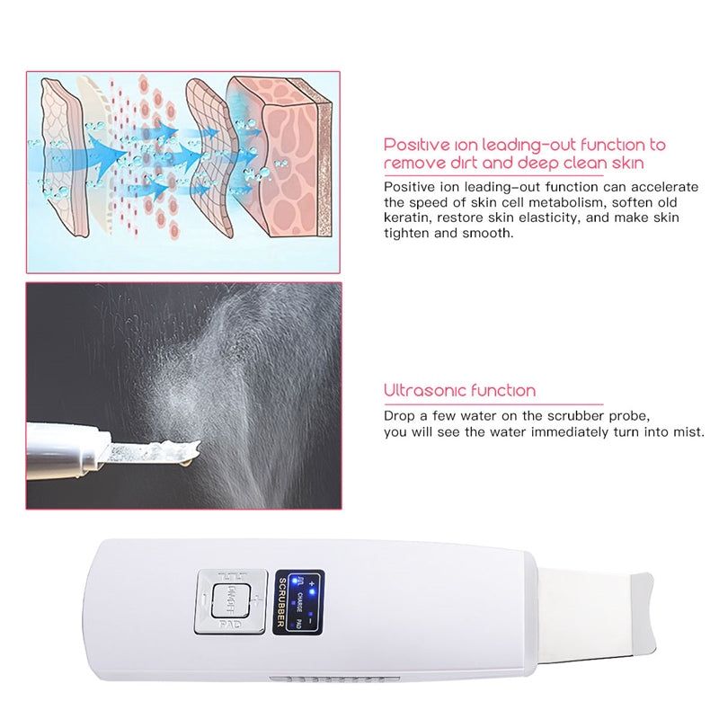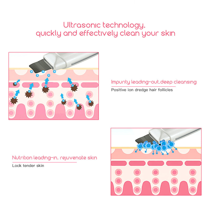 nettoyage en profondeur par ultrasons - La technologie d’oscillation ultrasonore à haute fréquence est transmise à la surface de la peau, produisant une pression et des vibrations instantanées. Il est capable de pénétrer la peau de 3 à 5 mm, élimine efficacement les points noirs, les peaux mortes et la saleté, permettant ainsi à votre peau de retrouver sa netteté et sa propreté.
